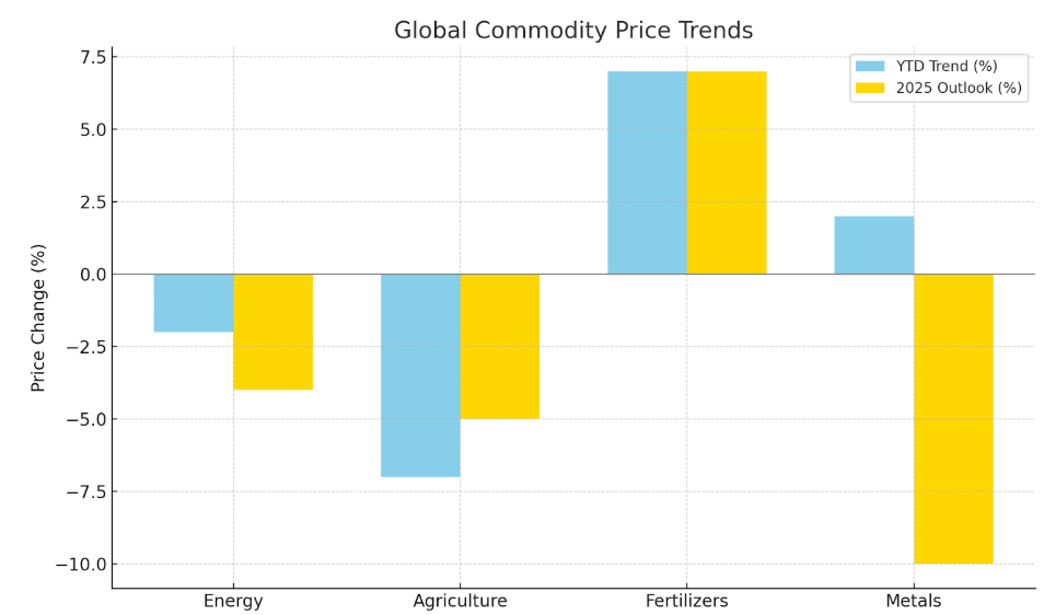 1. 📉 Overall Commodities The IMF global price index declined to 160.9 in May 2025, down about 1% from April and ~4.6% year-over-year The World Bank forecasts a broader commodity